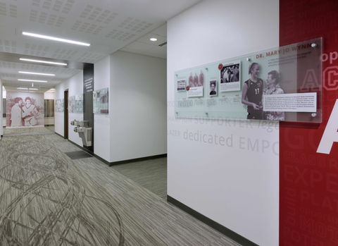 The design shows a balanced importance of athletic and academic achievements while leading to the achievement center honoring the life and accomplishments of Dr. Wynn. The renovation includes floor and ceiling finishes, perforated metal ceiling panels, exterior and interior signage, vinyl wall graphics, specialty glass panels showcasing academic all-stars, and a wood-wrapped study room inside the achievement center.